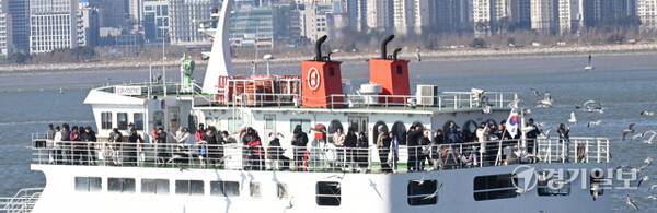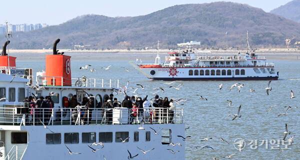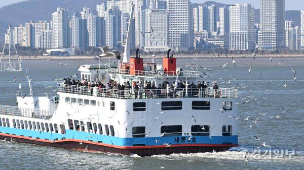 설 연휴 마지막 날인 18일 인천 중구 월미도 선착장에서 영종도 구읍뱃터로행 여객선에 승선한 나들이객들이 갈매기들에게 먹이를 주고 있다.