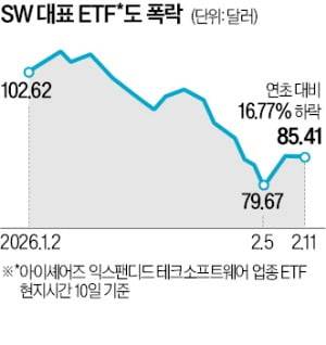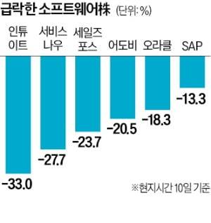 올 들어 지난 10일까지 고객관리 소프트웨어 업체 세일즈포스(-23.72%)를 비롯해 인튜이트(-33.06%), 서비스나우(-27.79%), 어도비(-20.59%) 등 주요 소프트웨어 업체 주가가 급락세를 이어갔다. 미국 대표 소프트웨어 상장지수펀드(ETF)인 ‘아이셰어즈 익스팬디드 테크소프트웨어 업종 ETF’도 연초 대비 16.77% 하락했다.