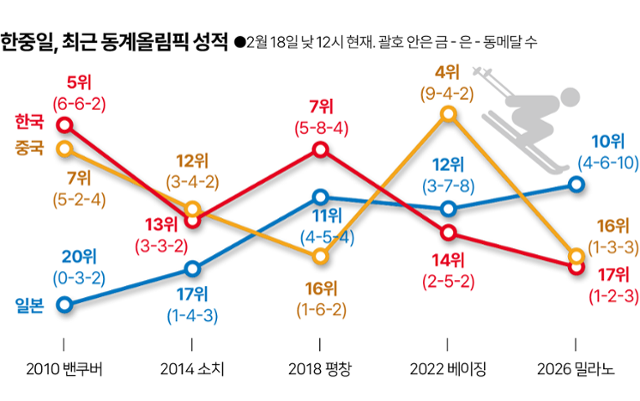 2026 밀라노·코르티나담페초 동계올림픽에서 동아시아 3국의 성적표가 극명하게 갈리고 있다.
