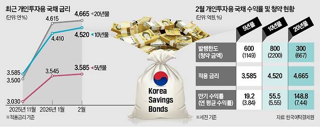 금융투자업계에 따르면 지난 12일 청약을 마친 2월 개인투자용 국채의 만기 보유 시 적용 금리는 5년 만기 연 3.585%, 10년 만기 연 4.520%, 20년 만기 연 4.665%다.