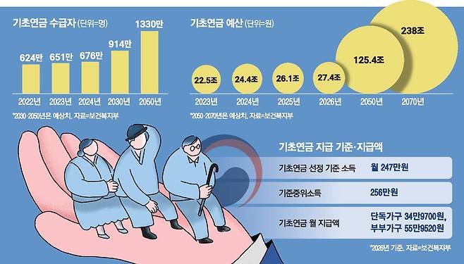65세 이상 노인의 70%가 받는 현재 구조 자체를 바꾸는 안은 중장기 개혁 방안에 담길 것으로 보인다. 이대로 가면 2050년에 기초연금 수급자만 1330만명에 달하고 기초연금 예산도 125조원에 이르기 때문에 소득·자산이 많은 노인은 수급 대상에서 제외하는 방안이다.