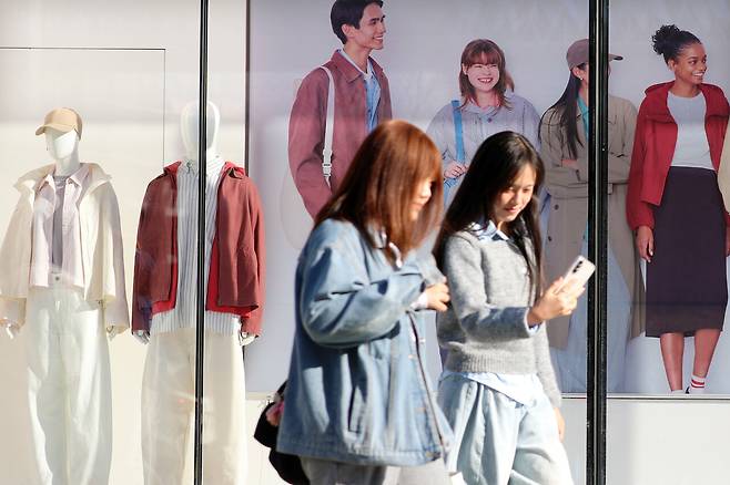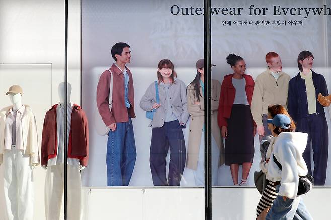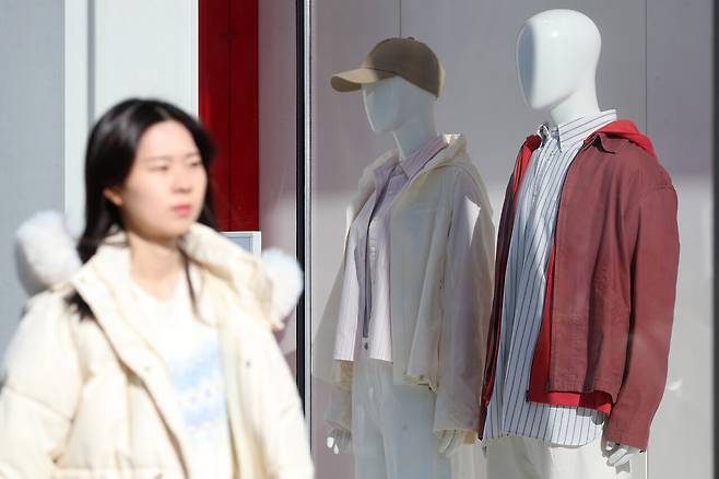 포근한 날씨를 보인 18일 오후 대전 서구 둔산동의 한 거리에서 시민들이 봄옷이 전시된 쇼윈도 앞을 지나고 있다. 두꺼운 외투 대신 한결 가벼워진 옷차림과 화사한 색감이 도심에 찾아온 봄기운을 전하고 있다.