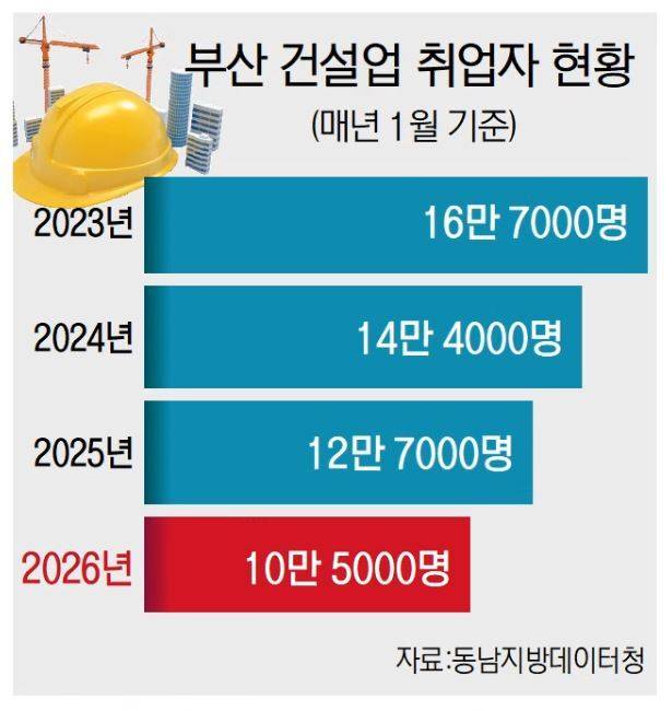 2023년 부산의 건설업 취업자는 16만 7000명으로 올해보다 6만 2000명이 많았다. 불과 3년 새 6만여 명의 일자리가 ‘증발’했다고 해도 과언이 아니다.