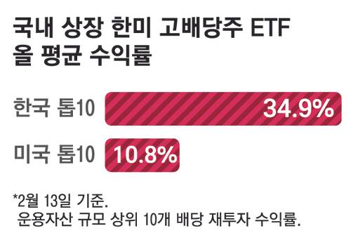 국내 상장 ETF 중 한국 고배당주 투자 상품 운용자산 상위 10개, 미국 고배당주 투자 상품 운용자산 상위 10개를 추려 두 집단의 배당 재투자 수익률을 비교한 결과 국내 고배당 ETF의 수익률이 미국 고배당 ETF 수익률을 큰 격차로 따돌렸다. 지난 13일 기준 한국 고배당주 ETF 10종은 올 평균 34.9% 상승했다. 반면 같은 기간 미국 고배당주 ETF 10종은 10.8% 상승했다.