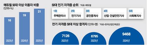 눈에 띄는 대목은 인공지능(AI) 기술의 발달로 사무직 업무가 빠르게 AI로 대체되면서 공공기관이나 금융기관 등에서 퇴직한 시니어조차 기술 분야 자격증 취득에 열을 올리고 있다는 점이다. 전기기능사 시험에서 50대 이상 합격자는 최근 2년 새 40% 이상 급증했다. 2022년 4832명이던 50대 이상 합격자는 2024년 6955명으로 늘었다.