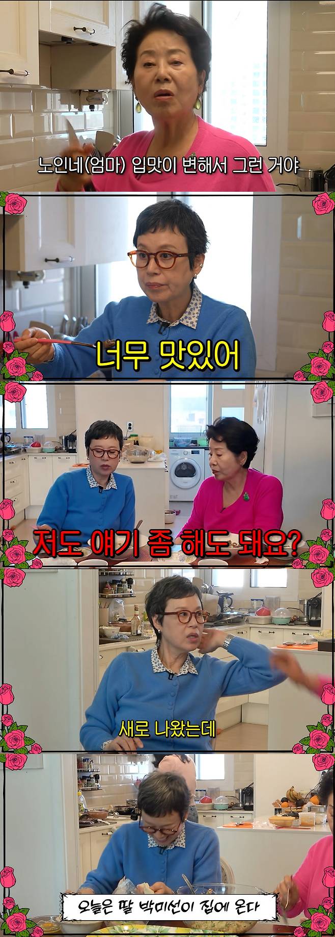 선우용여는 피자, 짜장면을 좋아한다는 박미선에 "너 이제 그거 끊어야 된다. 노땡큐다. 이제 메이드 인 코리아로 놀아야 한다"라며 엄마 답게 잔소리를 늘어놓았다.