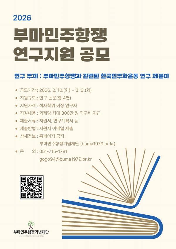 부마민주항쟁기념재단은 부마민주항쟁 연구기반을 조성하고 학문 후속 세대 양성을 위해 '2026년 부마민주항쟁 학술연구지원' 공모(포스터)를 내달 3일까지 진행한다.