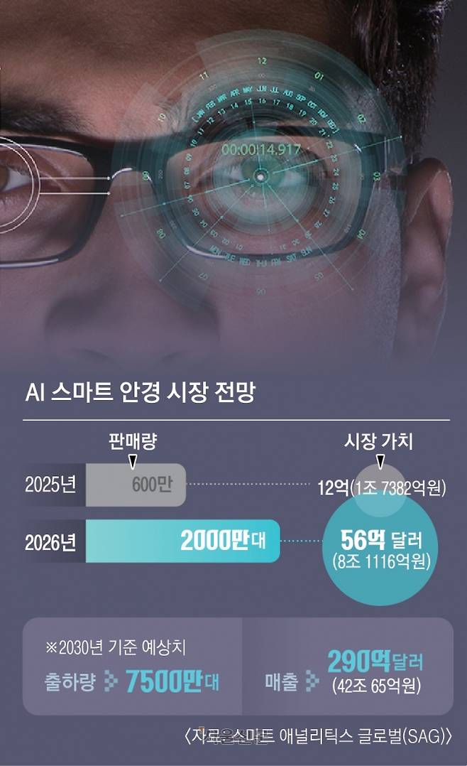 시장조사기관 스마트 애널리틱스 글로벌은 AI 스마트 안경 판매량이 지난해 600만대에서 올해 2000만대로 늘어나고 2030년에는 출하량이 7500만대에 이를 것으로 관측했다.
