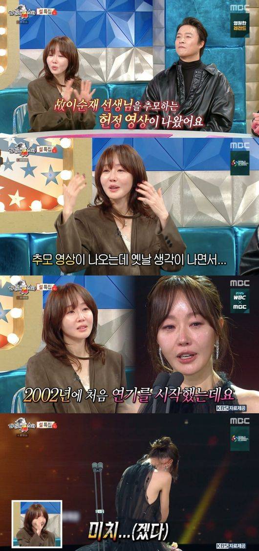 이어 “제가 13년전에 이순재 선생님이랑 드라마 ‘무자식 상팔자’ 가족드라마 했던 적이 있다. 그때 선생님께 연기 많이 배웠다. 배우로서 전환되는 순간이었다. 그때 과거가 회상되면서 눈물이 주체없이 터졌다”라고 털어놨다.