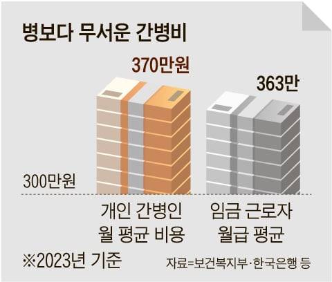 요양 병원비도 부담스러워 가족이 집에서 환자를 간병하는 경우도 많다. 정부의 2023년 노인 실태 조사에 따르면, ‘돌봄 제공자가 누구냐’는 질문에 응답 노인 중 가장 많은 81.4%(복수 응답)가 ‘가족’이라고 답했다. ‘개인 (고용) 간병인’이라고 답한 비율은 11%에 불과했다.