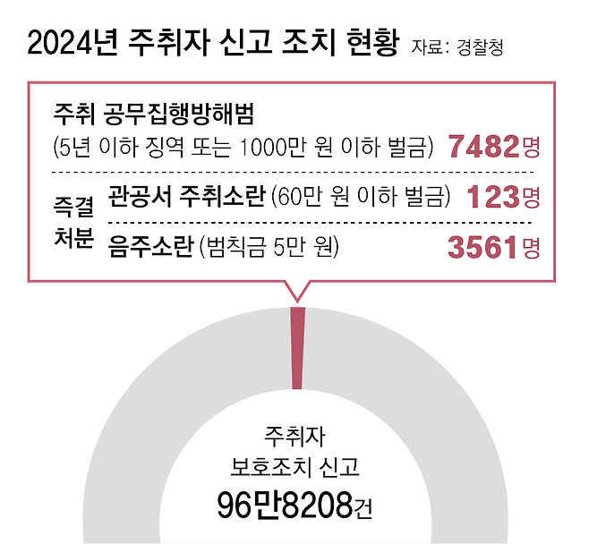 10일부터 14일까지 서울 주요 지구대 및 파출소 16곳을 살펴본 결과 밤낮을 가리지 않고 주취자의 난동과 업무 방해로 경찰 공권력이 속절없이 허비되고 있었다. 경찰관직무집행법에 따르면 술에 취해 자신이나 타인을 해칠 우려가 있는 주취자는 경찰의 보호조치 대상이기 때문에 지구대와 파출소 경찰들은 주취자 상대에 애를 먹고 있었다. 술에 취해 인사불성이 됐어도 직접적인 폭력을 행사하거나 기물을 파손하는 등 명백한 불법 행위를 저지르지 않는 이상 그들은 보호 대상으로 대우받는다.