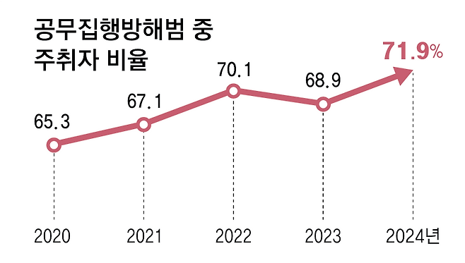 설령 경찰관에게 폭행을 휘두르는 등 묵과할 수 없는 난동을 부려 공무집행방해로 검거해도 집행유예나 벌금형에 그치는 경우가 대다수다. 지난해 8월 인천 연수구에서 도로를 점거한 채 경찰차 앞 유리에 바리케이드를 던지고 와이퍼를 부러뜨린 주취자는 공무집행방해로 검거됐지만 1심에서 징역 2년에 집행유예 3년을 선고받았다. 국회입법조사처에 따르면 공무집행방해 사건의 실형 비율은 12.8%에 불과하다.