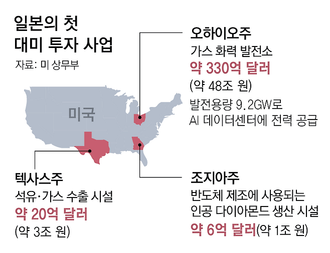도널드 트럼프 미국 대통령이 미일 무역합의에 따른 일본의 ‘1호 대미(對美) 투자’ 대상을 17일(현지 시간) 공개했다. 총 360억 달러(약 52조 원) 규모인 이번 투자 프로젝트는 △오하이오주 가스 발전소 △텍사스주 원유 수출 시설 △조지아주 합성 다이아몬드 제조 공장 건설로 구성돼 있다. 한국에 앞서 미국과 무역 합의를 맺은 일본의 첫 대미 투자 대상이 발표됨에 따라, 조속한 대미 투자 이행을 압박받고 있는 한국의 부담이 커질 수 있다는 우려도 나온다. 일본은 지난해 7월 관세를 25%에서 15%로 낮추는 대신에 총 5500억 달러의 대미 투자를 추진하기로 미국과 합의했다.