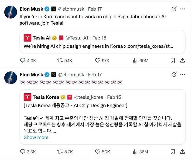 머스크 CEO는 17일(현지시간) 자신의 X(옛 트위터)에 테슬라코리아의 AI 칩 디자인 엔지니어 채용 공고를 공유하며 16개의 태극기 이모티콘을 올렸습니다.