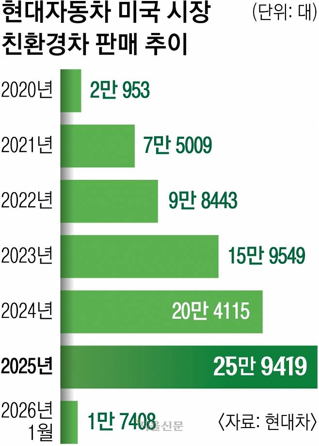 현대차는 2011년 미국 시장에서 쏘나타 하이브리드를 첫 판매한 뒤 지난달까지 친환경차를 총 101만 4943대 판매했다고 18일 밝혔다. 현대차는 미국 시장에서 2021년(7만 5009대)부터 2025년(25만 9419대)까지 5년 연속으로 연간 최다 친환경차 판매량을 경신했다. 지난달 친환경차 판매량도 1만 7408대로 지난해 동월 대비 30% 이상 늘었고, 1월 기준으로 역대 최다 판매량을 기록했다. 지난해 현대차의 전체 미국 판매량 중 친환경차 판매 비중은 26.4%다.