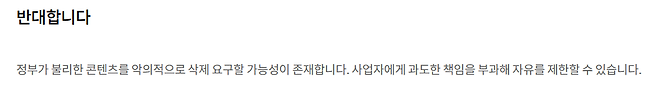 ‘국회입법예고’ 홈페이지에는 법안 발의 이후 이날 오후까지 보름간 2900여개의 의견이 올라왔다. 거의 대부분 반대 의견을 표명한 게시글로 ‘반대합니다’라는 제목이 달렸다. ‘정부가 불리한 콘텐츠를 악의적으로 삭제 요구할 가능성이 존재합니다. 사업자에게 과도한 책임을 부과해 자유를 제한할 수 있습니다’라는 동일한 문장의 의견이 수백개씩 달렸다. 특정 집단의 ‘좌표 찍기’에 따른 의견 개진일 가능성을 배제하기 어렵다.