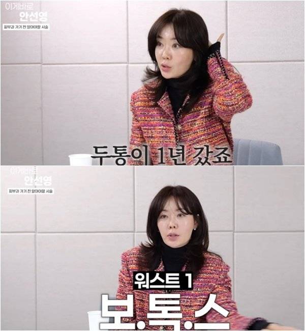 안선영은 먼저 겨드랑이 레이저 제모 후 보톡스를 맞았다가 부작용을 겪었다고 밝혔다. 땀이 과도하게 나는 문제를 해결하려고 보톡스를 선택했지만 이후 다른 부위로 땀이 번지는 현상이 생겼다는 것이다. 그는 “다시는 그 부위에 보톡스를 맞지 않겠다”며 “전문의와 충분히 상담하고 결정해야 한다”고 말했다.