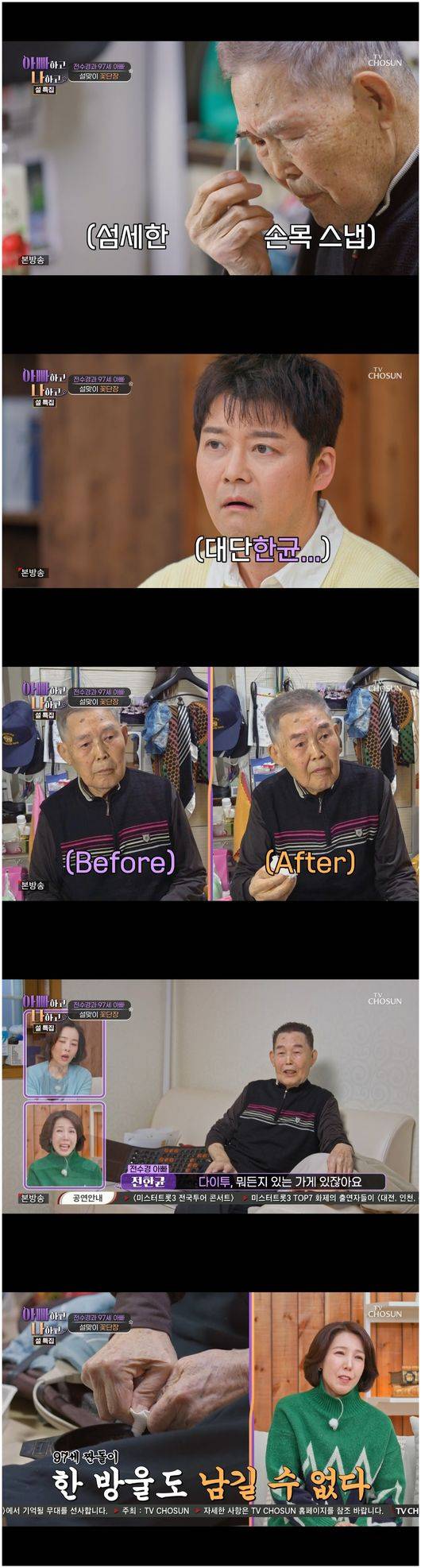 전수경의 아버지는 “난 어딜 가서도 60대, 70대가 있어도 돈 걸고 있으면 다 한다. 내가 10살 때부터 역기를 들었다. 우리 어머니가 ‘한균이는 조그마한 게 역기를 어떻게 드냐’라고 하냐. 어렸을 때부터 운동했다는 징조가 있다”라며 뿌듯해했다. 이런 아버지의 기를 살려주고자 전수경이 직접 방문했다. 설 선물까지 야무지게 챙겼다.
