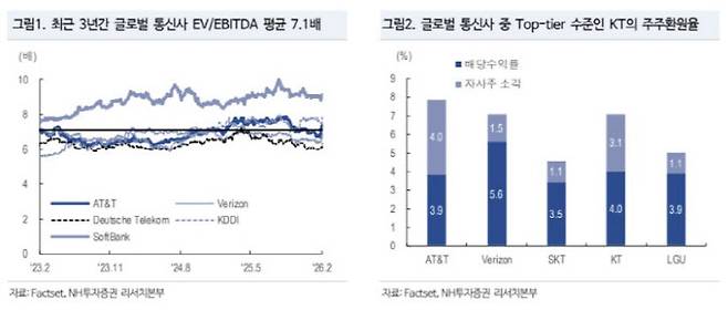 그러면서 “KT는 글로벌 통신사들 중 최고 수준의 주주환원율(현금배당 4.0%, 자사주소각3.1%)을 보유하고 있다”며 “기업가치 대비 상각전 영업이익(EV/EBITDA)은 4.1배로 글로벌 주요 통신사 평균 7.1배에 비해 현저히 저평가됐다”고 판단했다.