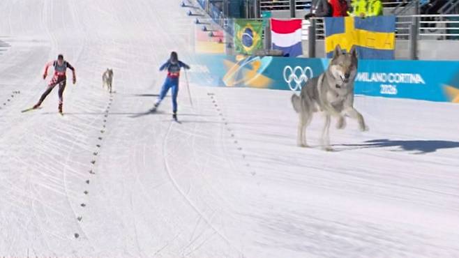 올림픽 여자 크로스컨트리 스키 경기에 체코슬로바키아 늑대개가 깜짝 등장했습니다.