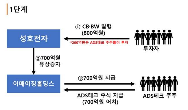 성호전자는 800억원 중 700억원을 '어매이징홀딩스'가 추진하는 유상증자에 참여합니다. 어매이징홀딩스는 ADS테크를 위해 성호전자가 설립한 특수목적법인(SPC)입니다. 어매이징홀딩스는 곧바로 700억원을 ADS테크 주주들에게 지급하고 이에 상응하는 ADS테크 주식을 받습니다. 이 주식 거래가 완료되면 1단계 거래는 종결됩니다. 1단계까지 정리한 그림은 아래와 같습니다.