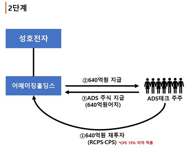 이로써 어매이징홀딩스에 다시 640억원이 들어왔습니다. 이 투자금 전량은 ADS테크 주식을 매입하기 위한 자금으로 사용됩니다. 즉, ADS테크 주주들이 어메이징홀딩스에 투자한 돈이 다시 주주들에게 꽂히는 셈입니다. ADS테크 주주들이 이에 상응하는 ADS테크 주식을 지급하면 2단계 거래는 종결됩니다. 아래는 2단계를 도식화한 그림입니다.