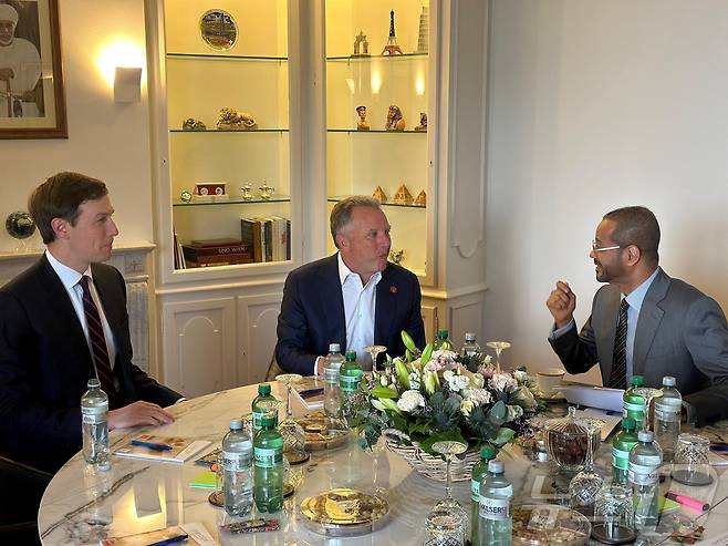 (제네바 로이터=뉴스1) 류정민 특파원 = 17일(현지시간) 스위스 제네바에서 열린 미국-이란 간 핵 협상을 앞두고 미국의 스티브 위트코프 트사와 도널드 트럼프 미국 대통령의 사위 재러드 쿠규너가 사이드 바드르 빈 하마다 알 부사이디 오만 외무장관과 회담하고 있다. 2026.02.17.