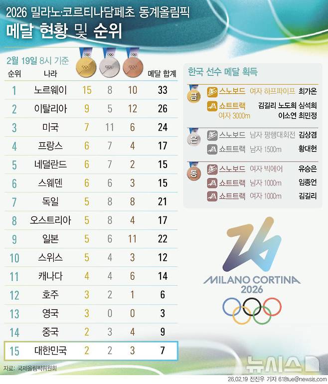 [서울=뉴시스] 2026 밀라노·코르티나담페초 동계올림픽에서 한국은 19일 오전 8시 기준 금메달 2개, 은메달 2개, 동메달 3개로 종합 15위를 기록했다. 이날 한국 쇼트트랙 여자 대표팀이 여자 3000m 계주에서 금메달을 따냈다. (그래픽=전진우 기자)