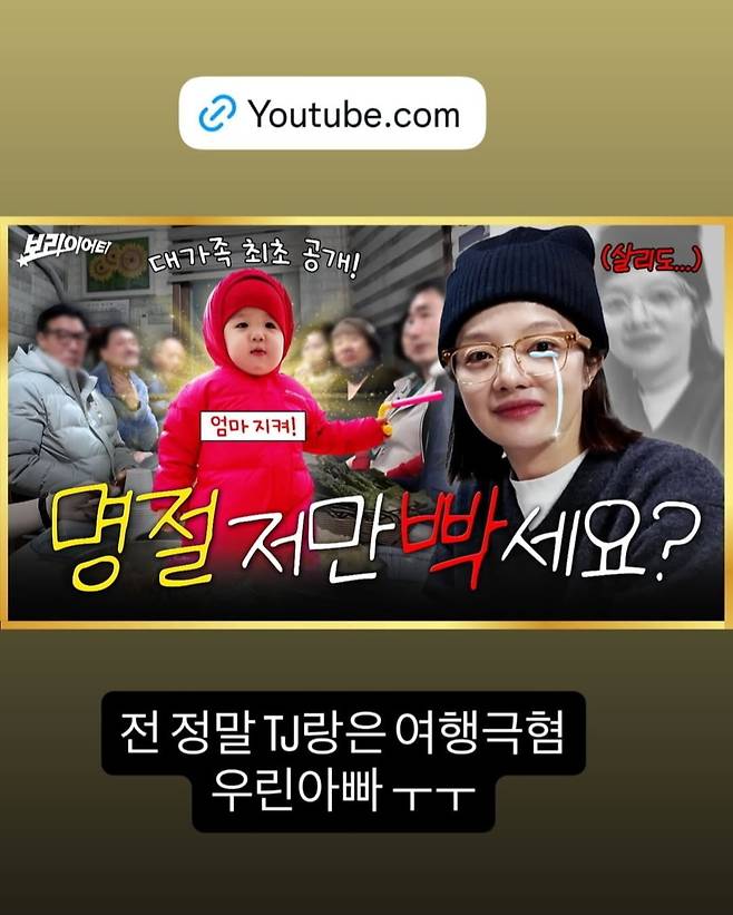 공개된 사진 속에는 황보라가 자신의 유튜브 채널에 영상을 업로드한 듯 썸네일이 보여지고 있는 모습. 썸네일 안에는 '명절 저망 빡세요?'라고 적혀 있었고, 황보라는 동행한 인물과 여행 스타일이 맞지 않았는 듯 눈물을 보이고 있어 눈길을 끌었다.