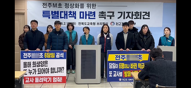 | ▲ 2026년 2월 10일 전북도교육청에서 진행한 기자회견에서 오도영 전교조 전북지부장이 발언하고 있다. |