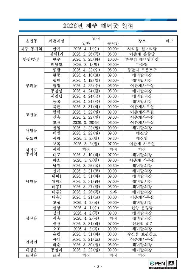 제주 해녀들의 무사안녕과 풍어를 기원하는 '해녀굿'이 2월 21일 서귀포시 남원읍 신례리 어촌계를 시작으로 4월까지 제주지역 38개 어촌계에서 봉행된다.