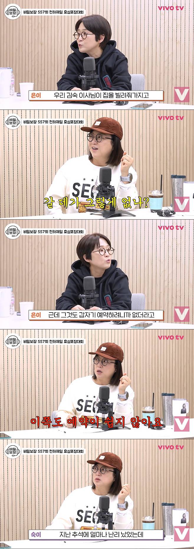 김숙은 "없다. 지금 우리 집도 많이 예약 차있다. 다른 분이랑 조율해야 한다"고 말했고 송은이는 "조율했다. 뒤에 오실 분한테 다 얘기해놨다"고 답했다. 김숙은 "지난 추석에 얼마나 난리 났는데.