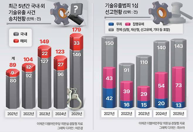 19일 경찰청에 따르면 2025년 경찰이 적발한 기술유출 범죄 건수는 179건(국내 유출 146건·해외 유출 33건)으로, 2021년 89건에 비해 약 2배 증가한 수치를 기록했다. 지난해의 경우 이틀에 한 번꼴로 기술유출이 일어난 셈이다. 기술 유출 범죄 피해액은 최근 5년간 23조원 이상일 것으로 추정된다.