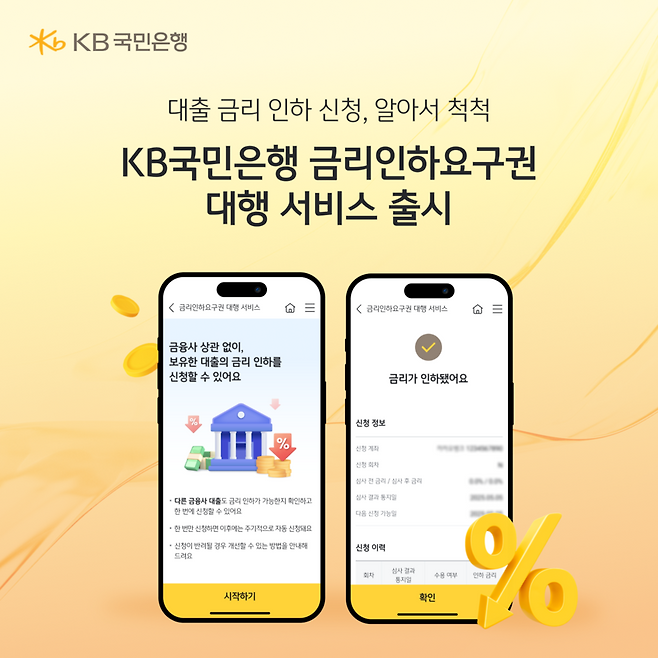 KB국민은행(은행장 이환주)은 오는 26일 마이데이터로 연결된 타 금융사 대출까지 한 번에 대출금리 인하를 신청할 수 있도록 돕는 ‘금리인하요구권 대행 서비스’를 선보인다고 오늘(19일) 밝혔습니다.