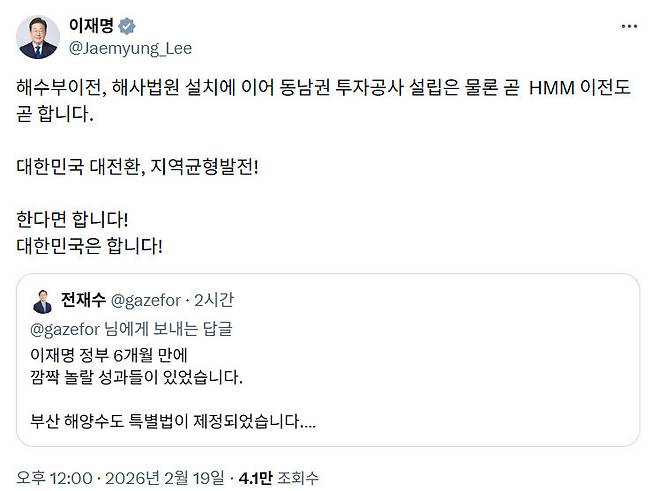 이 대통령은 19일 소셜미디어 엑스(X·옛 트위터)에 부산시장 출마가 거론되는 전재수 더불어민주당 의원의 글을 공유하며 “대한민국 대전환, 지역균형발전! 한다면 한다! 대한민국은 한다”고 적었다. 오는 6월 지방선거를 앞두고 부산 지역 현안에 힘을 싣는 메시지로 해석된다.