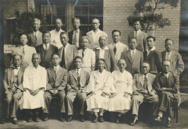 | ▲ 조선어학회 사건으로 탄압을 받은 인사들이 조직한 십일회 회원들의 모습 (앞줄 왼쪽부터 김윤경, 정세권, 안재홍, 최현배, 이중화, 장지영, 김양수, 신윤국. 가운데 줄 왼쪽부터 김선기, 백낙준, 장현식, 이병기, 정열모, 방종현, 김법린, 권승욱, 이강래. 뒷줄 왼쪽부터 민영욱, 임혁규, 정인승, 정태진, 이석린. 총 22명 촬영. 1949년 6월 12일에 첫 모임을 갖고 찍은 사진으로 판단됨. 사진은 권한솔 님이 제공.) |