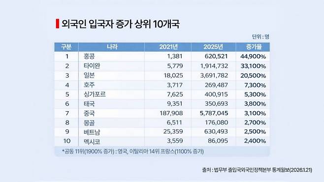외국인 입국자 증가 상위 10개국을 살펴보면 첫 번째가 홍콩이다. 5년 전과 비교해 무려 4만 4900% 증가했다. 완전 가파르다. 타이완 일본도 상위권에 들었다. 주목되는 게 호주다. 입국자 10위 안에는 들지 못했는데 증가 순위에서는 4위를 기록했다. 7300% 증가했다. 호주인들에게 한국은 아시아의 대표 관광지로 떠올랐다. 한국을 찾는 호주인들이 많이 늘었다고 호주 언론이 보도했을 정도다. 이어 싱가포르 태국 중국 몽골 베트남 순이다. 그리고 멕시코가 10위에 올랐다. 멕시코는 5년 전과 비교해 2400% 증가했다.