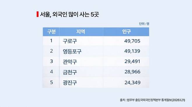 그렇다면 대한민국에서 외국인들은 어디에 살고 있을까? 서울에서 외국인들이 가장 많이 사는 곳은 구로구다. 영등포구 관악구 금천구 광진구 등에도 많이 산다.