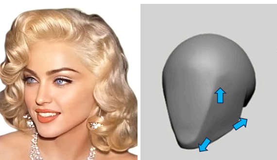 <하관이 얼굴선을 팽팽하게 지지하는 얼굴은 얼굴의 외곽선과, 광대에서 턱 끝으로 이어지는 볼륨선의 장력이 유지됩니다. 사진- 마돈나, 이미지 출처 Anatomy for Sculptors>