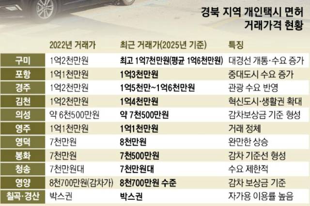 가장 가파른 상승세를 보인 곳은 구미다. 2022년 1억2천만원 수준이던 거래가는 최근 최고 1억7천만원까지 형성되며 평균 1억6천만원 안팎을 유지하고 있다. 이는 감차 보상금 1억2천500만원을 크게 웃도는 수준이다. 대경선 개통과 지역 축제 확대, 맞춤형 택시 정책 등으로 수요가 늘어난 점이 배경으로 꼽힌다.
