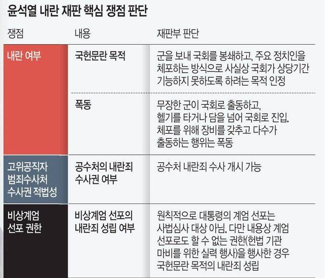 재판부는 당시 국회로 군을 투입한 행위는 헌법이 정한 대통령의 계엄 선포 권한을 넘어선 것이고, 그 자체로 내란 행위가 성립한다고 판단했다.