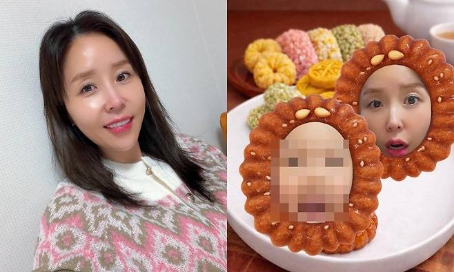 사진 속에는 접시에 담긴 한과와 차 세트가 놓인 가운데, 약과 필터로 얼굴이 합성된 신지와 조카의 모습이 담겼다.