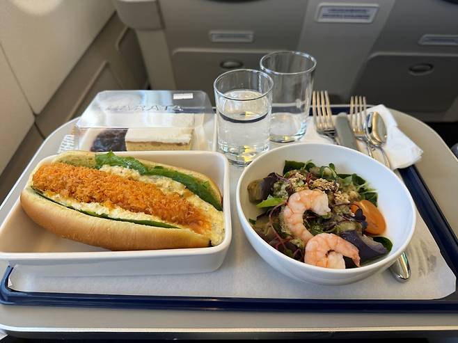 공간뿐 아니라 서비스에서도 차별화된 모습을 보여준다. <흑백요리사 2>에서 ‘사시미 검객’으로 활약한 최규덕 셰프가 감수를 맡은 기내식이 그렇다. 비행시간이 짧다 보니 한상 차림이지만, 가지 미소바질 샐러드, 새우카츠 샌드, 진저 사워크림 케이크까지 전식·본식·후식까지 모두 갖췄다. 맥주·칵테일 등 주류 서비스도 제공한다. 최근 여타 항공사들이 비용 효율화를 위해 서비스를 최소화하는 것과는 대조적으로, 넉넉한 인심이 느껴진다.