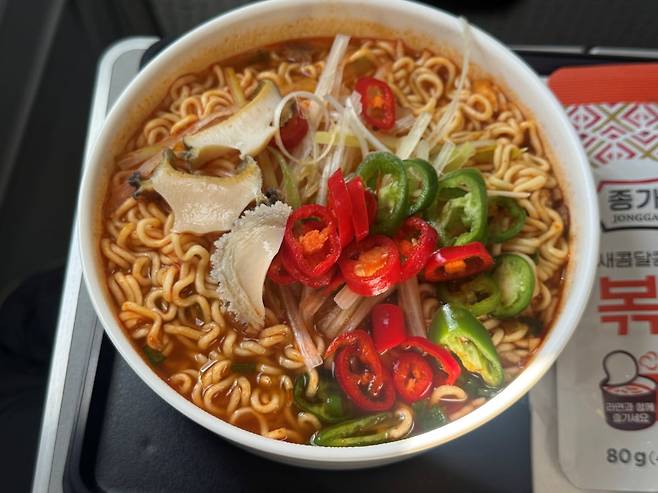 통상 비행기 안은 기압이 낮고 건조해 미각이 둔해진다고 한다. 같은 음식이라도 지상에서보다 맛이 없다는 의미다. 그러나 칼칼한 라면 국물과 반찬으로 제공된 볶음김치의 조합은 기내 환경의 한계도 이겨낸다. 특히 해외의 밍밍한 음식에 질린 입맛을 깨우는 해장라면으로 제격일 듯하다. 가격은 1만2000원. 풍성한 토핑에 정성이 느껴지는 라면 한 그릇으로는 합리적인 가격처럼 보인다.