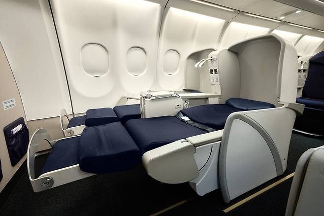가장 먼저 눈에 띄는 것은 여유 공간. 앞좌석과의 간격은 74인치(188cm), 너비는 21인치(53cm)로 넉넉했다. 두 다리를 쭉 뻗어도 앞좌석에 닿지 않을 정도인데, 이코노미 클래스는 물론이고 대형 항공사(FSC)의 비즈니스 클래스와 비교해도 확연히 넓은 정도다.