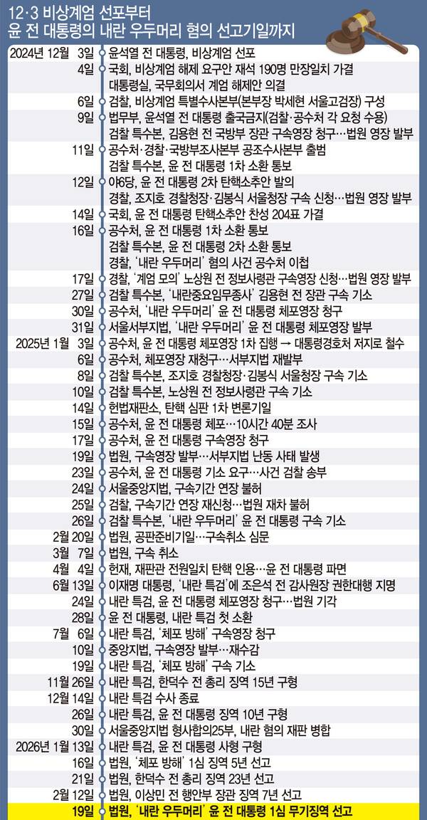 서울중앙지법 형사합의25부(지귀연 부장판사)는 19일 내란 우두머리 혐의로 기소된 윤 전 대통령에게 무기징역을 선고했다. 2024년 12·3 비상계엄 선포 이후 443일 만에 나온 사법부의 첫 판단이다.