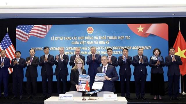 베트남 권력서열 1위인 또 럼 베트남 공산당 서기장의 미국 방문을 계기로 베트남 항공사 3곳이 미국 보잉 항공기 96대를 비롯해 370억 달러, 우리 돈 53조6천억 원 규모의 항공기·엔진 도입 계약을 발표했습니다.