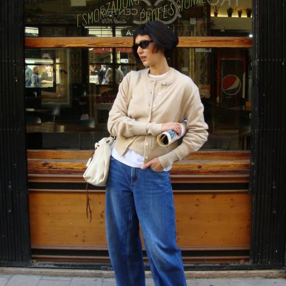 가디건 셋업이라고 하면 왠지 클래식한 이미지가 먼저 떠오르죠. 이 룩은 그 고정관념을 완전히 깨버립니다. 베이지 톤 카디건에 셋업 이너 니트를 매치하고, 일부러 화이트 티셔츠가 보이도록 한 번 더 레이어링 했는데요. 여기에 편안한 배기 진을 매치하니 셋업의 완성도는 가져가면서 캐주얼한 멋이 더해집니다. 카디건 셋업, 생각보다 훨씬 쉽고 자유롭죠?