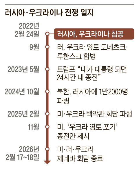러시아와 우크라이나 전쟁을 끝내기 위해 지난 17~18일 스위스 제네바에서 열린 미국·우크라이나·러시아 3자 회담이 종료됐다. 앞서 지난달 23~24일 아랍에미리트 아부다비에서 첫 3자 회담이 열렸을 때에는 러시아 측이 “건설적 협상이었다”는 반응을 내놔 이번 2차 회담에서는 진전이 있을 것이라는 관측도 나왔지만, 성과 없이 종료됐다. 이에 따라 2022년 2월 24일 러시아의 전면 침공으로 시작된 전쟁은 종전 돌파구가 보이지 않는 상황에서 발발 4주년을 맞게 됐다.