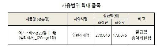 사용범위 확대 품목 = 적응증이 늘어나면서 사용범위가 확대돼 가격이 떨어지는 신약도 있다. 안텐진제약 엑스포비오정20mg인데, 이 약제는 이전에 한 가지 이상의 치료를 받은 다발골수종 성인 환자의 치료에 보르테조밉과 덱사메타손과의 병용요법으로 효능효과를 인정받았다. 보험 선진국 중에는 미국, 영국, 독일, 프랑스 이탈리아에 등재돼 있다.